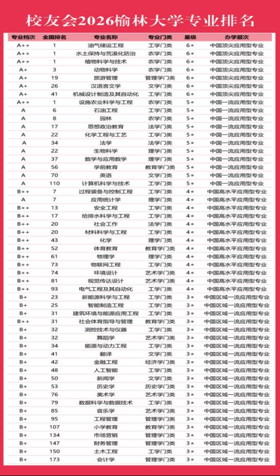 本次排名中,我校油气储运工程、水土保持与荒漠化防治、植物科学与技术、动物科学、旅游管理、汉语言文学、机械设计制造及其自动化7个专业荣获2026中国六星级应用型专业(6★),跻身中国顶尖应用型专业行列;11个专业获评中国五星级专业(5★);13个专业入选中国四星级专业(4★),21个专业评为中国三星级专业(3★),全方位展现了学校专业群的强劲竞争力。在2026中国大学专业分档排名中,学校4个专业评为A++,4个专业评为A+,11个专业评为A,13个专业评为B++,20个专业评为B+,成为全国应用型高校专业建设的领跑者。